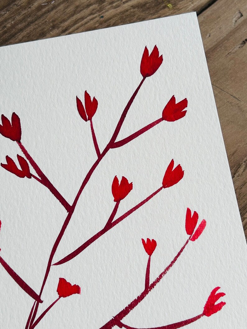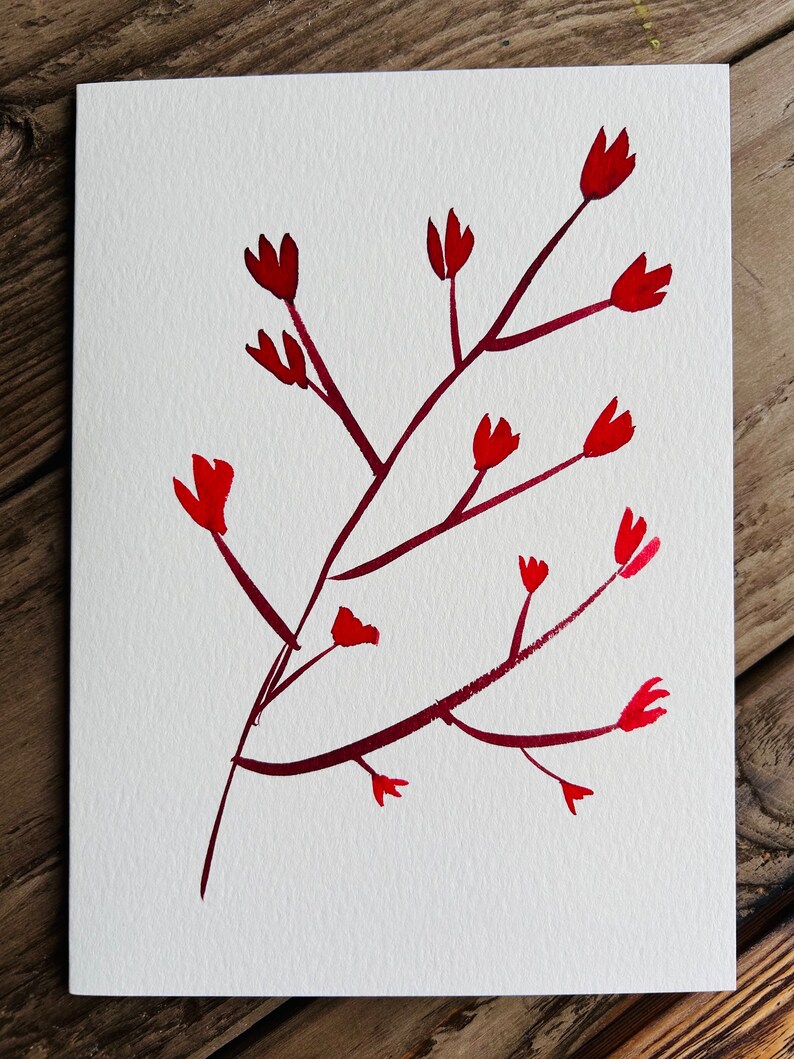 A pretty red floral card I painted using inks. This card is handmade not a printed card. A unique one off card to send as a birthday card or housewarming card. It’s blank inside to write your own message. Envelope included. This card would also be beautiful framed in your home. SIZE 5” x 7”