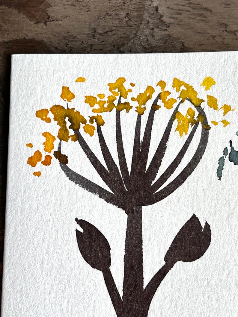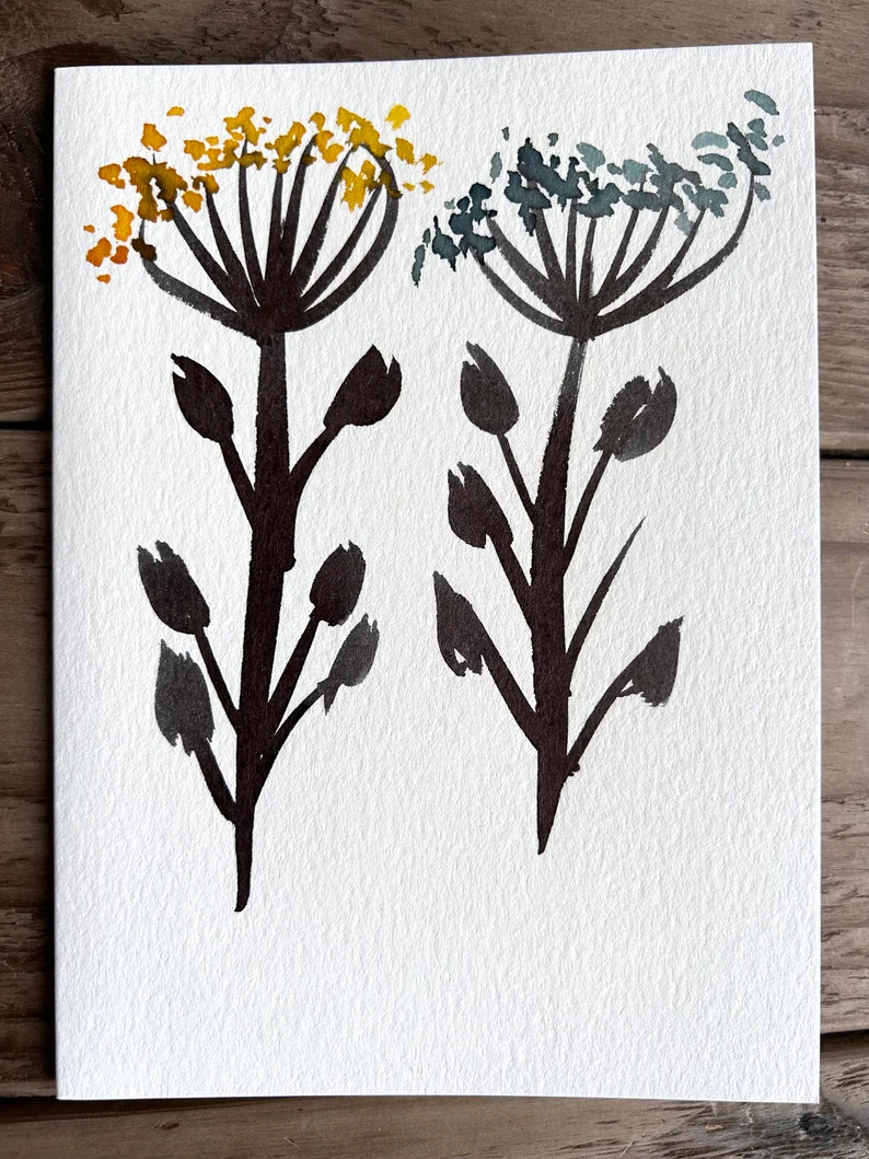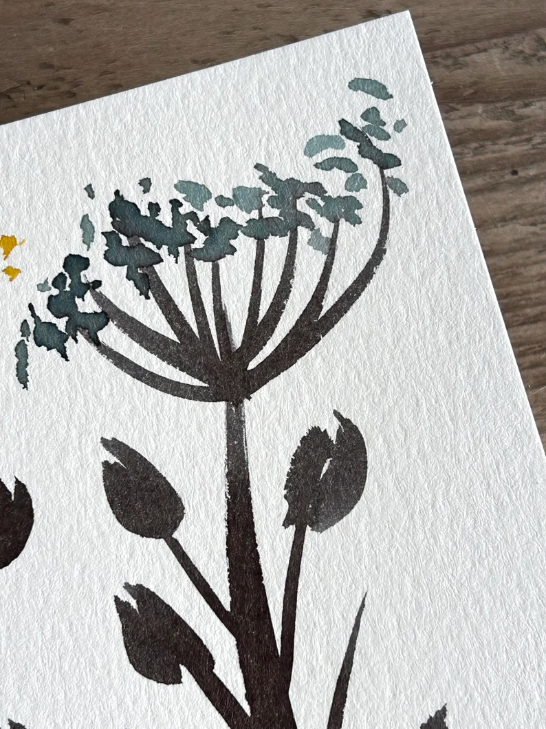 A pretty floral greetings card. Handmade painted using inks- not a print as this is a one off original! High quality textured watercolour card with envelope included. Perfect unique card to send or frame it as a little abstract artwork. SIZE 5” x 7”.