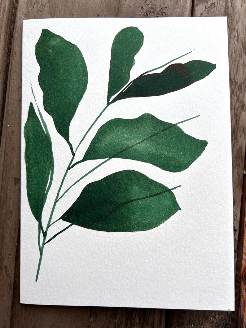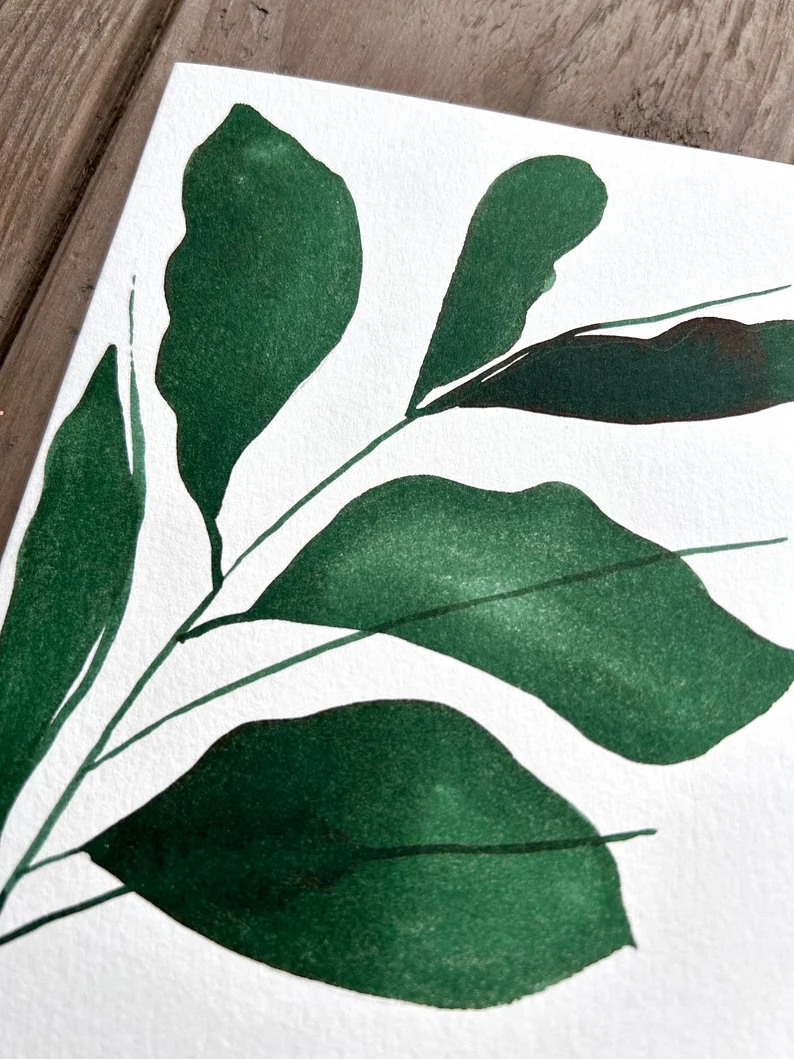 I painted this green abstract leaf card by hand using inks. This is the original artwork – not a print. A unique card to send or frame yourself for your home. SIZE 5” x 7”