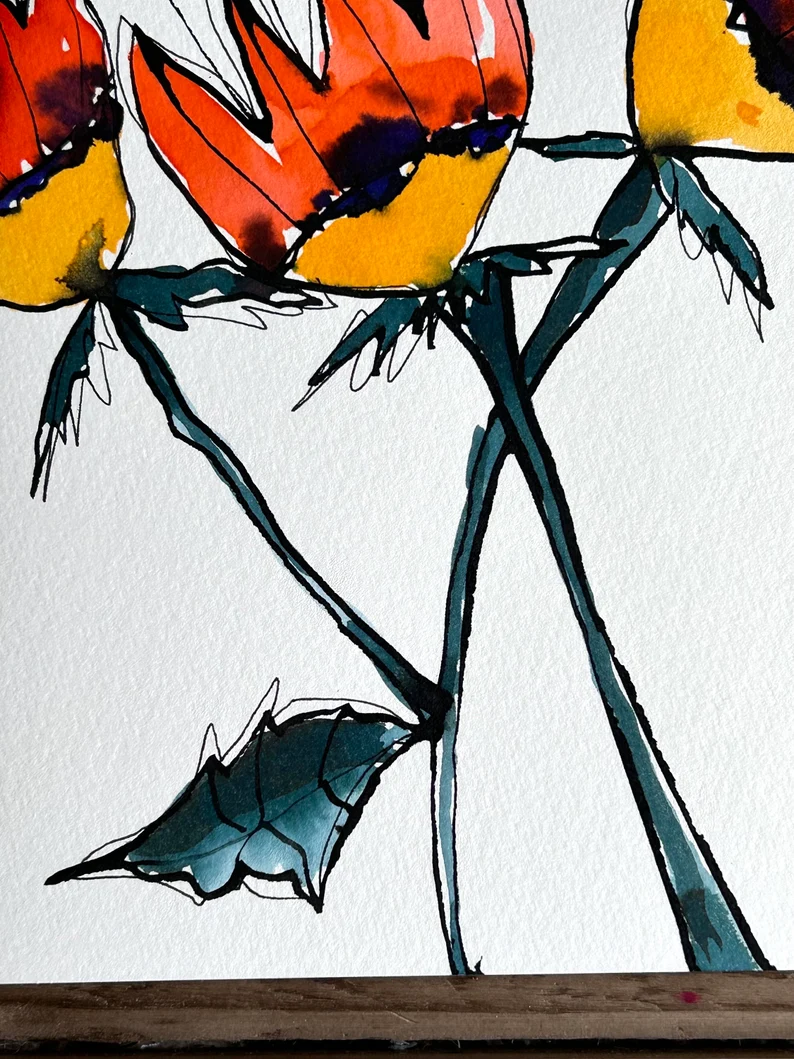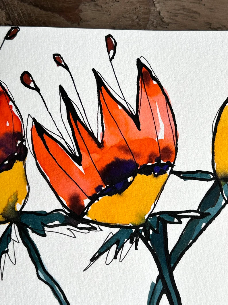 A unique handmade greeting card painted by hand using Windsor and Newton inks. A one off design of abstract tulips. PLEASE NOTE – as photographed there’s a little inky mistake inside the card – made a little mess with the inks after I had painted it ! Just shows it’s the original! It’s painted on beautiful textured watercolour card and comes with an envelope. Blank inside to write your own message. SIZE is 5” x 7”