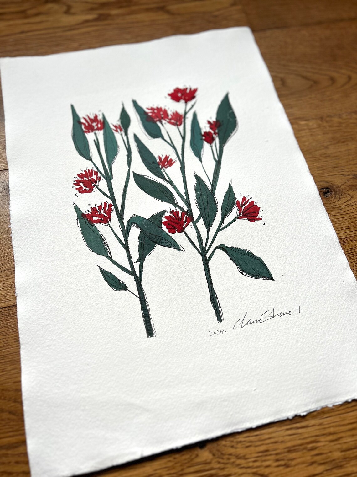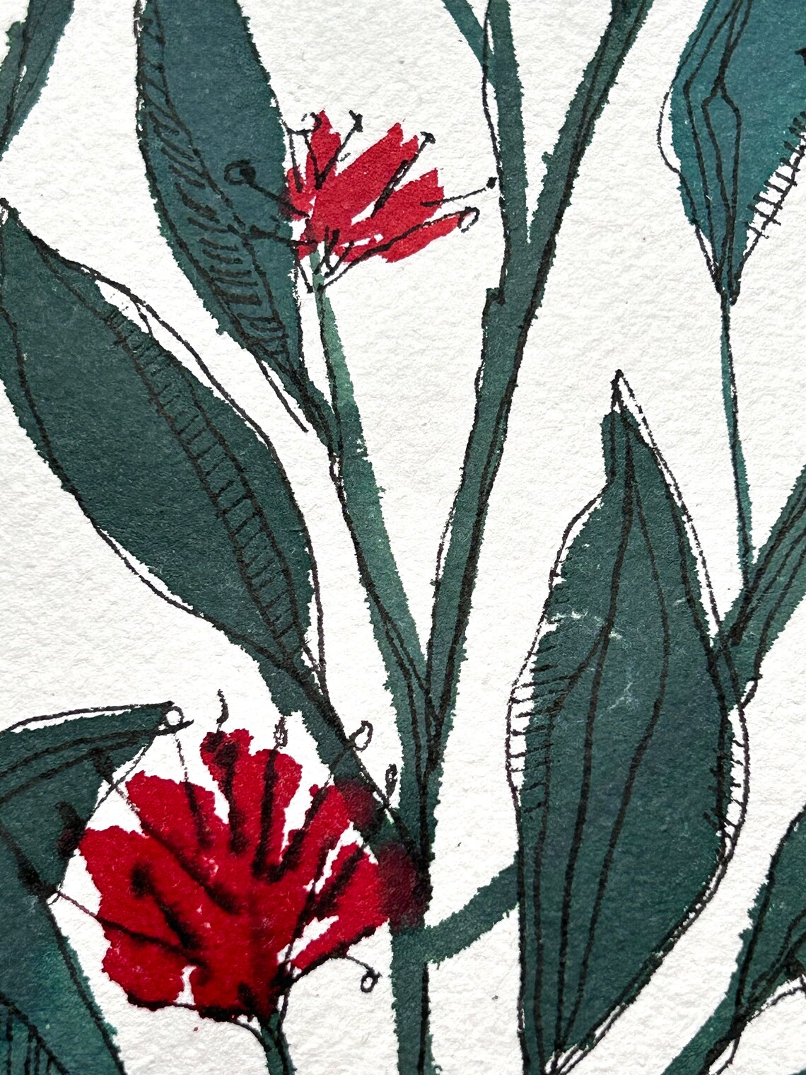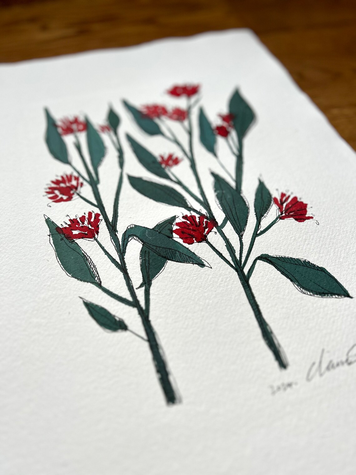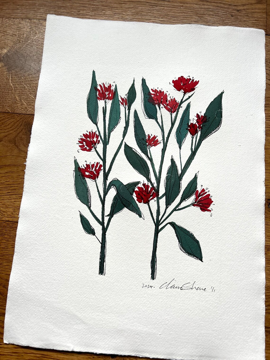 Hand painted ink and pen botanical floral painting. This is an original painting- not a print. I used inks and a fine ink pen. Painted on beautiful Khadi handmade paper