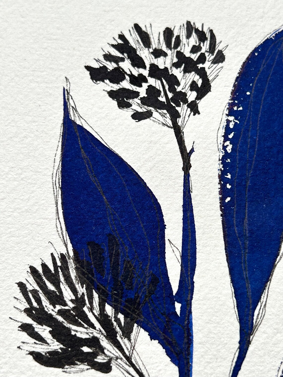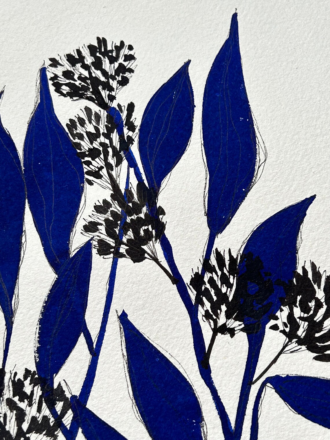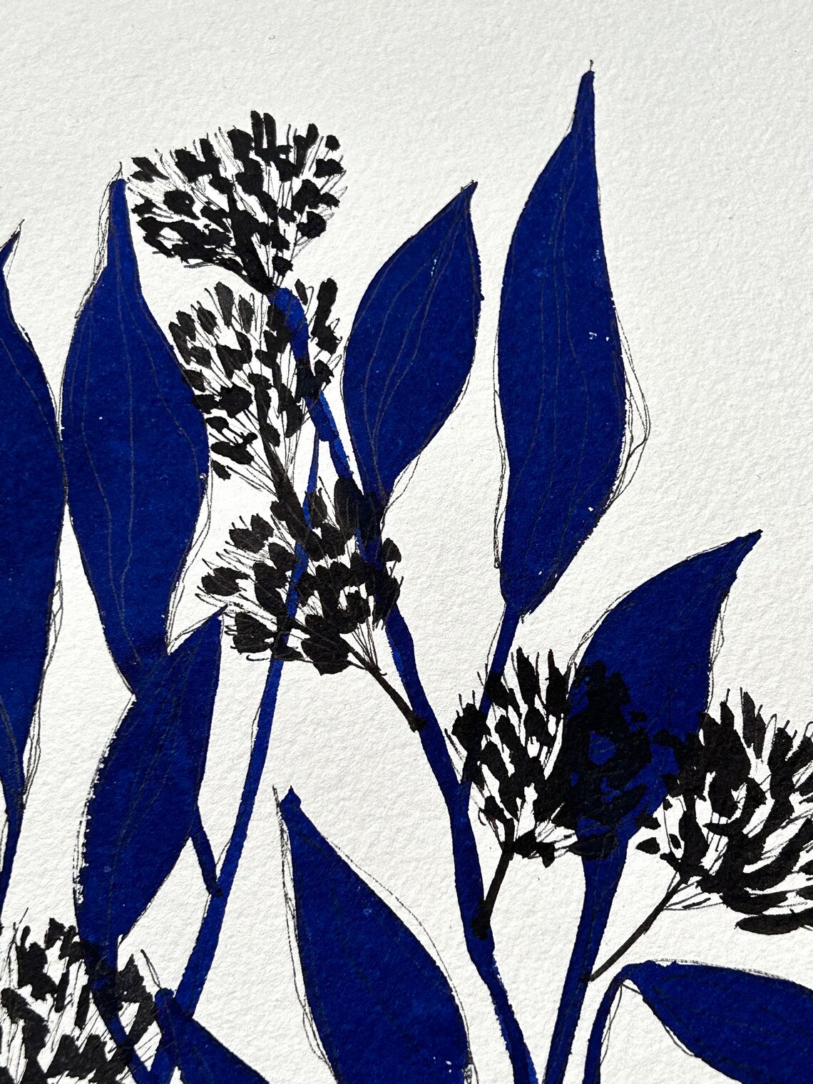 Loose ink painting of blue leaves and dainty black flowers. This is an original painting not a print. Handpainted using inks with tiny details using a fine ink pen. Painted on Khadi handmade 100% cotton rag paper. Selling unframed