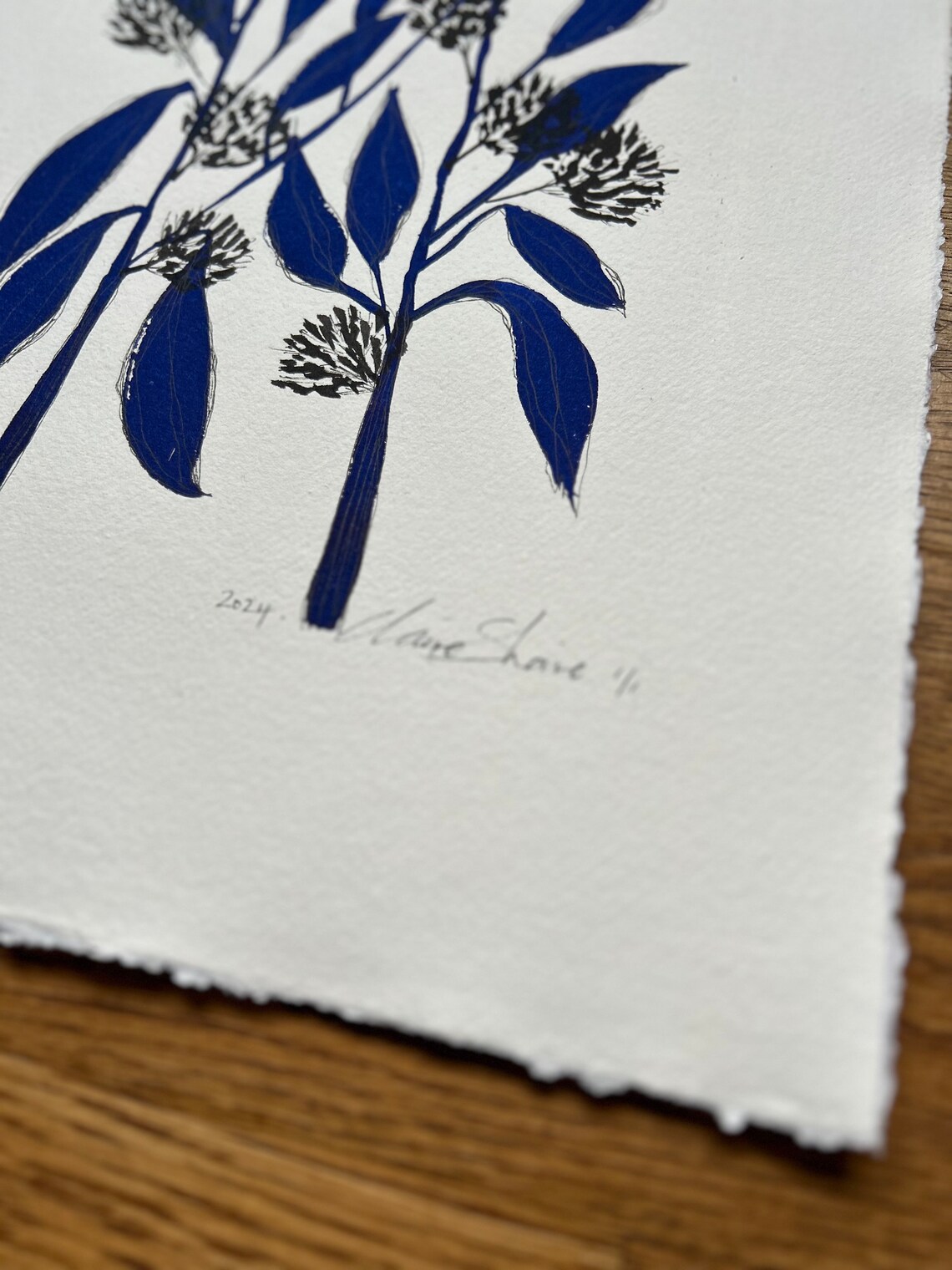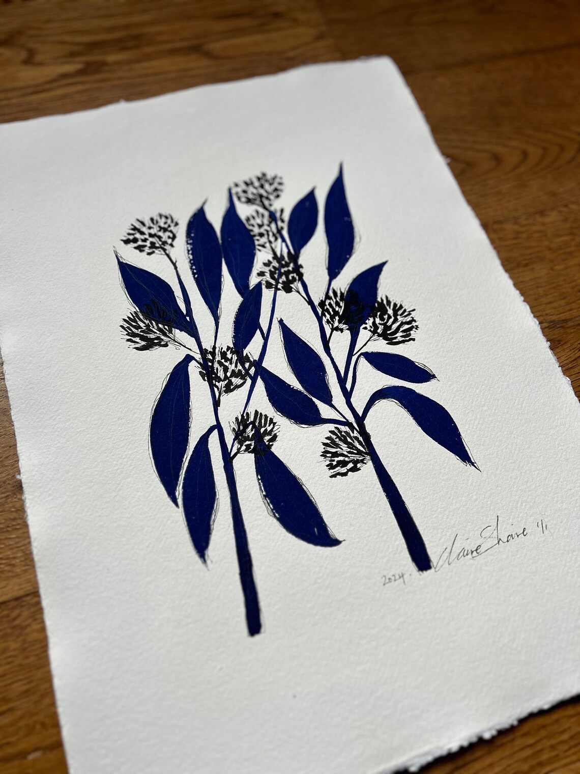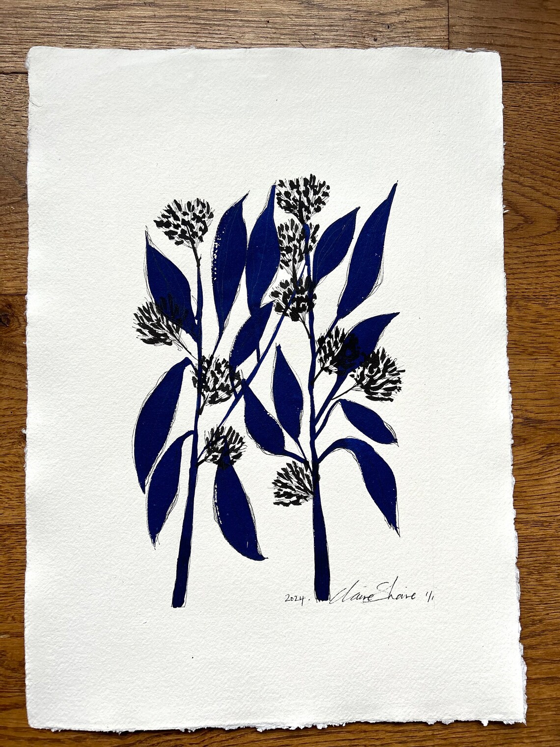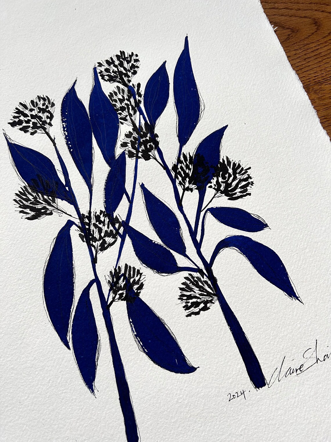 Loose ink painting of blue leaves and dainty black flowers. This is an original painting not a print. Handpainted using inks with tiny details using a fine ink pen. Painted on Khadi handmade 100% cotton rag paper. Selling unframed