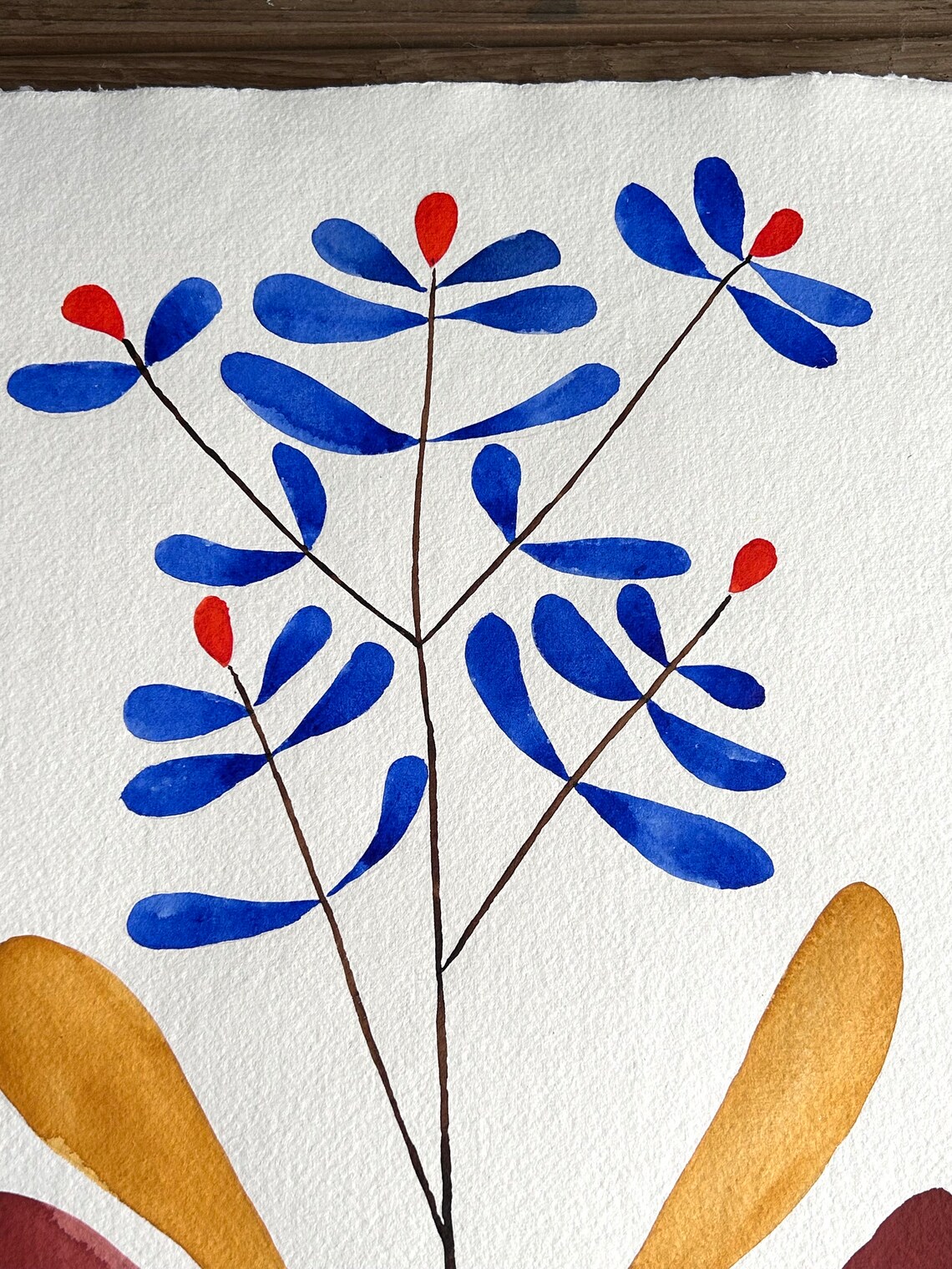An original piece of artwork sold unframed. Part of a new watercolour collection for spring 2024. I used windsor and newton watercolour paints on Khadi 100% cotton rag paper which has a beautiful texture. Bright abstract flowers in blues and browns bottom