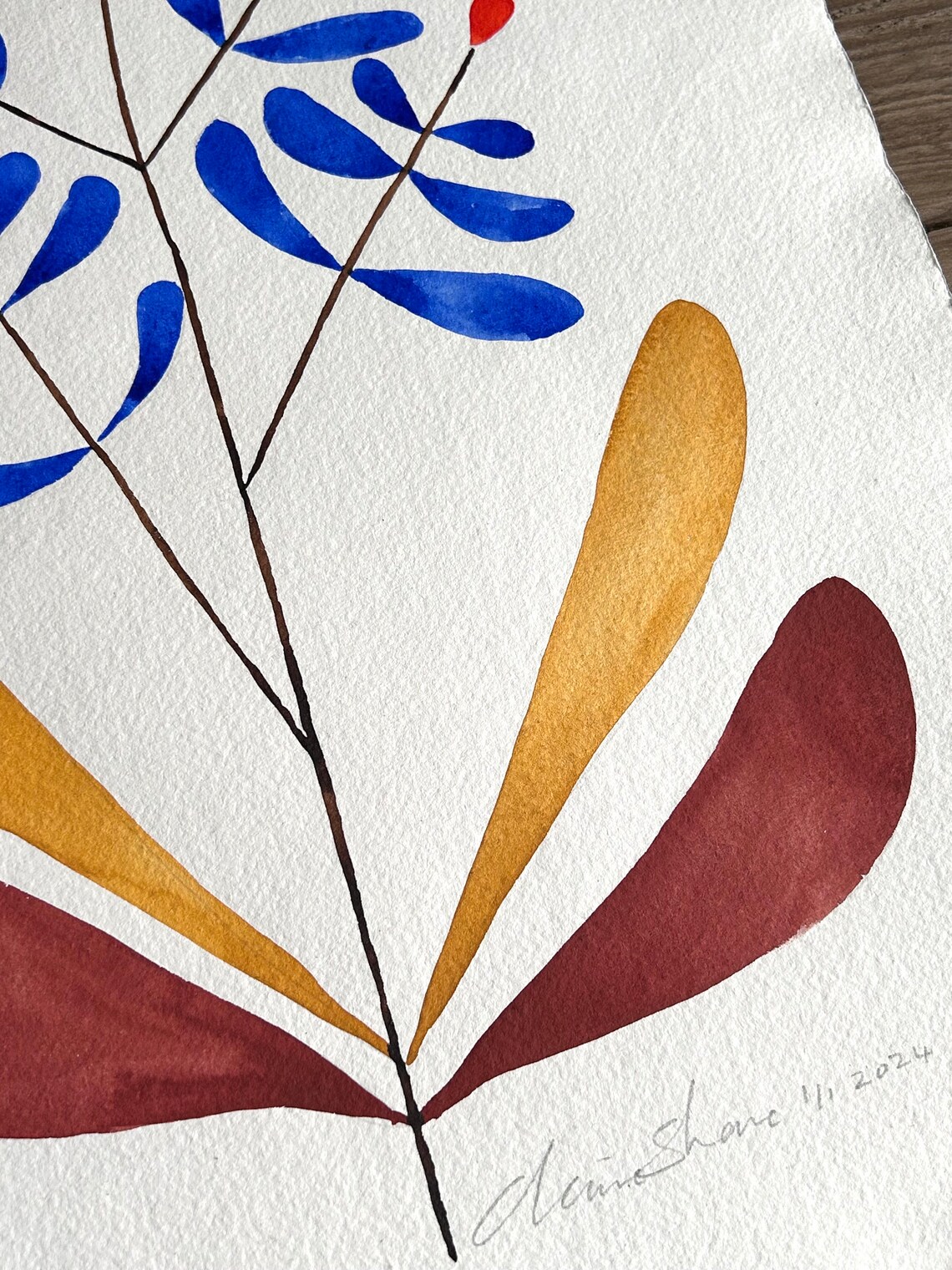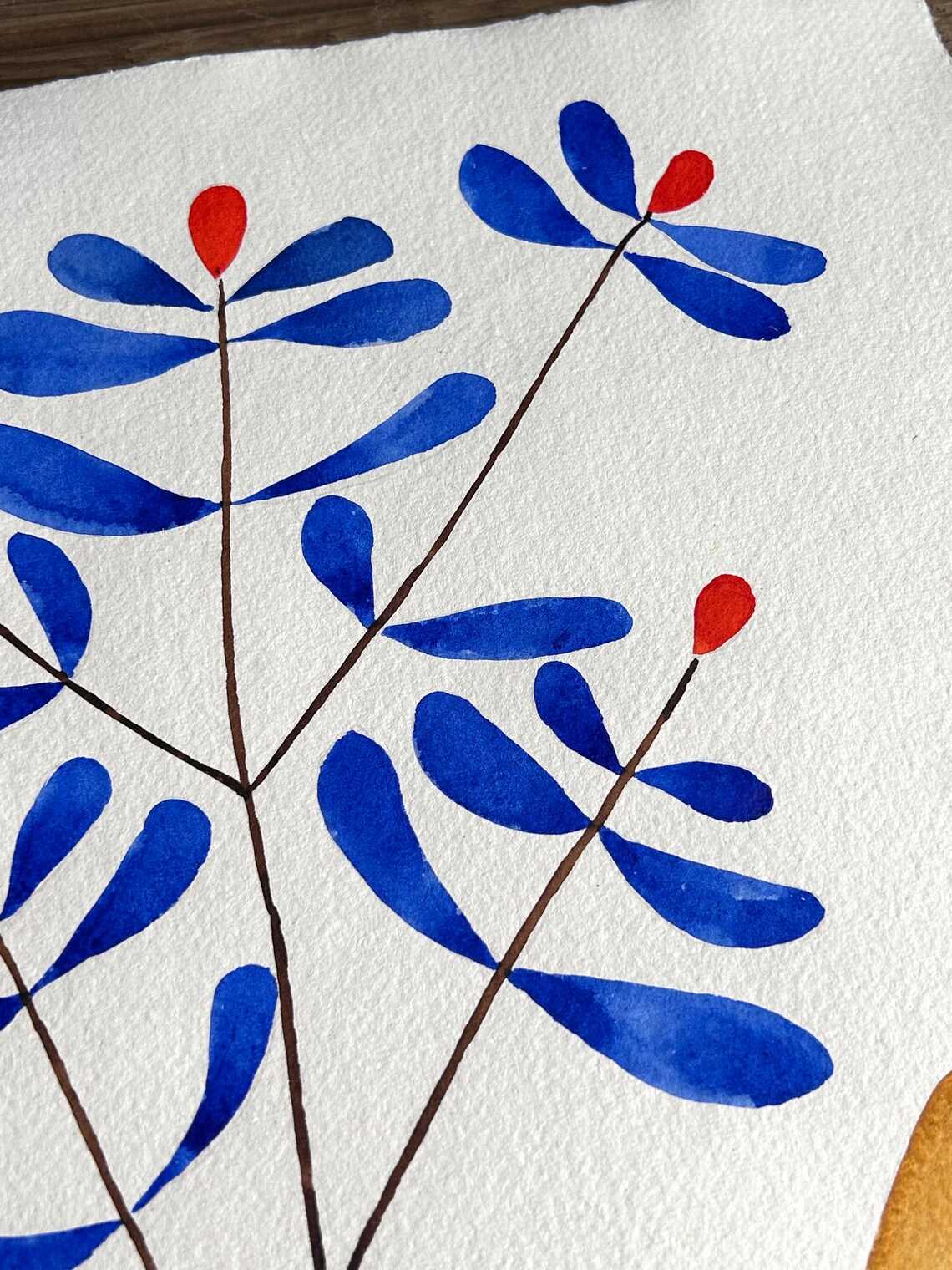 An original piece of artwork sold unframed. Part of a new watercolour collection for spring 2024. I used windsor and newton watercolour paints on Khadi 100% cotton rag paper which has a beautiful texture. Bright abstract flowers in blues and browns