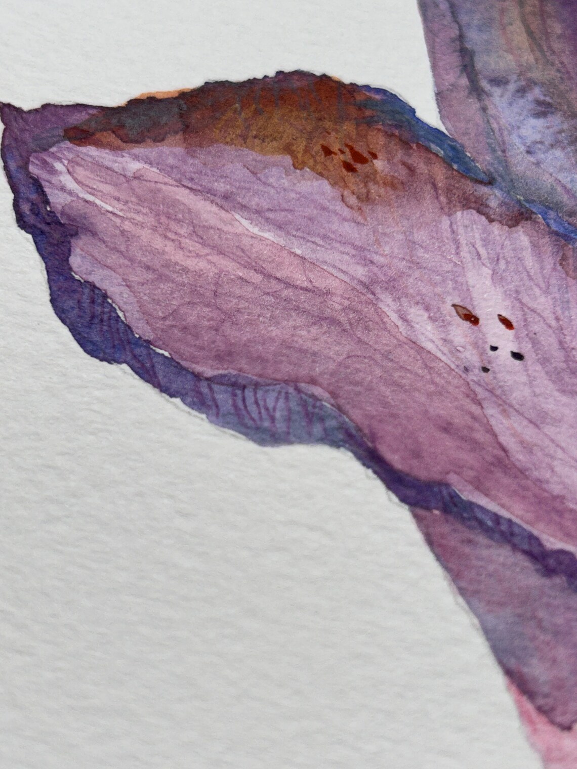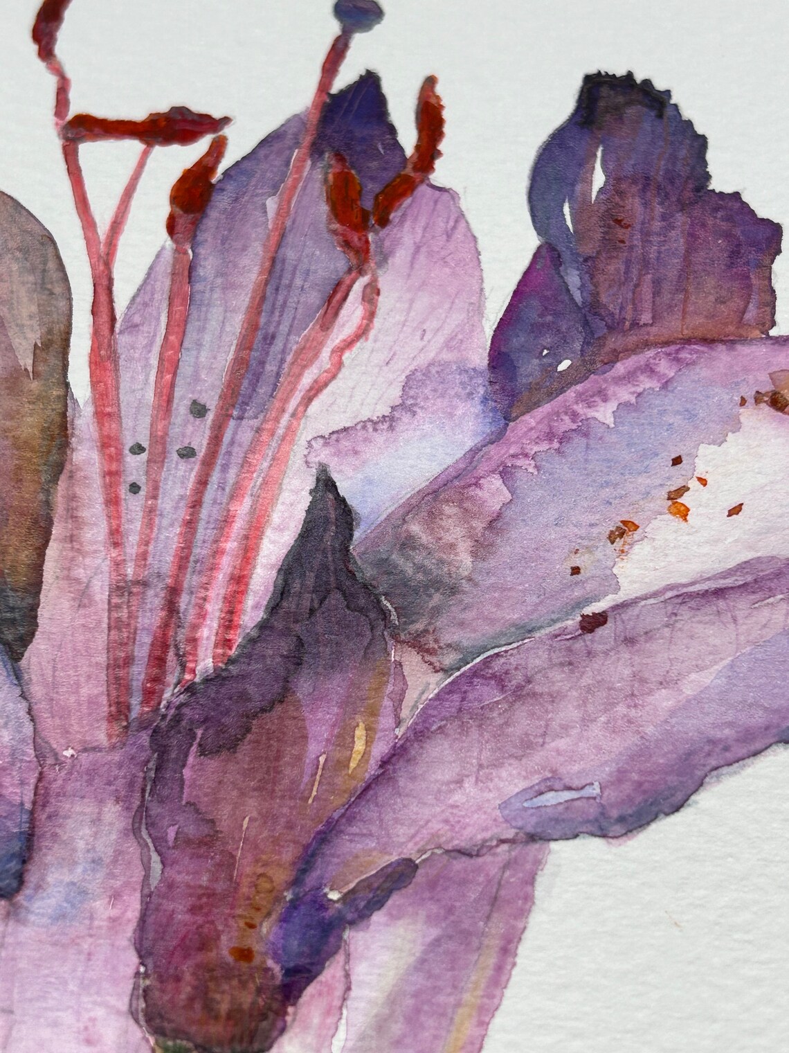 An original watercolour painting of a large purple Lily. I painted this in 2023 using watercolours. Painted by hand it took 5 hours to finish. I painted on high quality textured watercolour paper